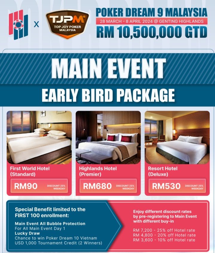 말레이시아 2024 TJPM & Poker Dream 쿠알라룸푸르 시리즈는 다가오는 2024년 3월 28일부터 4월 8일까지 숨막히는 말레이시아 겐팅 하이랜드에서 열릴 예정입니다. 탑조이포커투어 말레이시아(TJPM) 토너먼트는 새롭게 디자인된 챔피언십 트로피와 링을 두고 구름 속에서 다수 포커 플레이어들이 경쟁할 예정입니다.